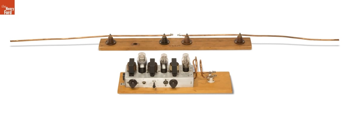The Piccard stratosphere flight departed Ford Airport field on October 23, 1934. Spouses Jean and Jeannette Piccard ascended 10.9 miles in a metal gondola carried by a hydrogen balloon. To maintain ground communication, William Duckwitz built a radio transceiver and antenna, installing it in the "radio car" trailing the flight. Duckwitz's call sign, W8CJT, is burned into its base.