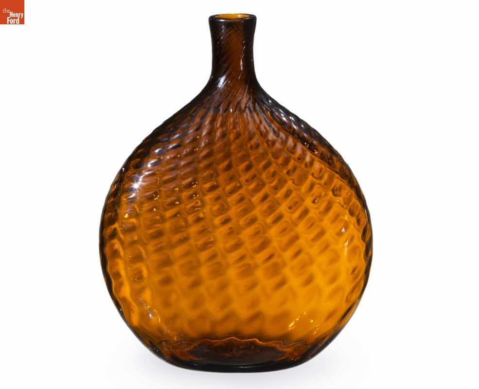 American glass factories produced flasks, like this one, from the late 1700s well into the mid-1800s. The pint-sized flask could hold water but more likely contained alcoholic beverages. Its textured decorative exterior -- formed when the hot glass was dipped into a pattern mold before it was blown -- made the flask easier to grasp. And its flattened shape fit nicely into pockets providing ready access to the liquid refreshment.
