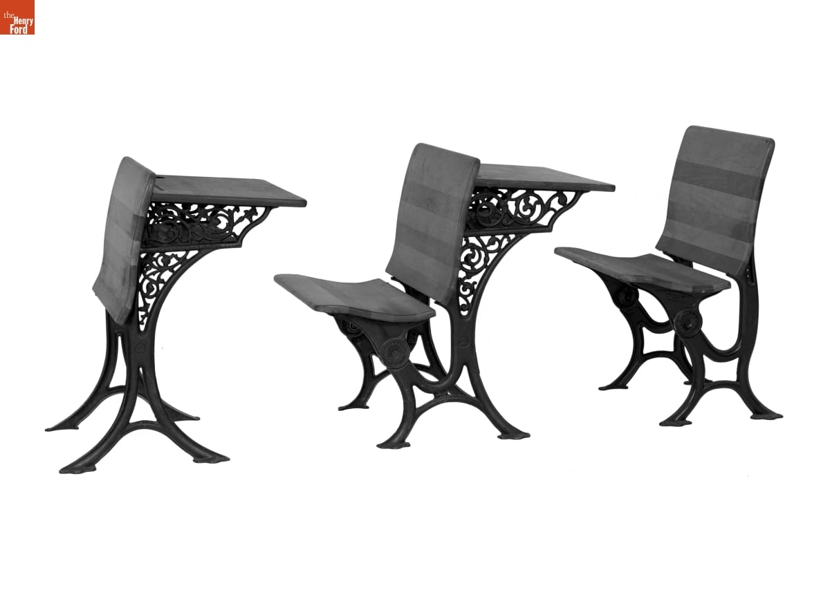 The importance that nineteenth-century Americans put on the technology of education is indicated by the hundreds of patents on school furniture between 1860 and 1900. Desks designed to be in rows facing the teacher reveal the teacher-centered classrooms of the era. These cast iron and wood school desks and benches were manufactured in Buffalo, New York, in about 1900.