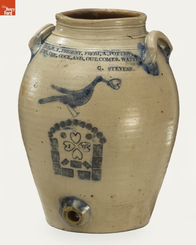 This water cooler was made of a durable, leak-proof pottery called stoneware, shaped on a potter's wheel. The orange-peel-like outer glaze was created when the potter threw handfuls of common rock salt into a white-hot kiln during the piece's firing. Salt-glazed stoneware pieces were decorated with an amazing array of designs, including the bird and hearts on this piece.