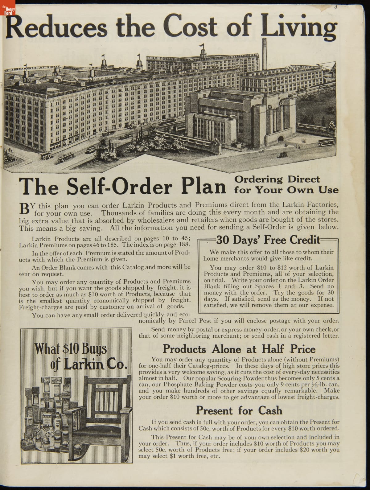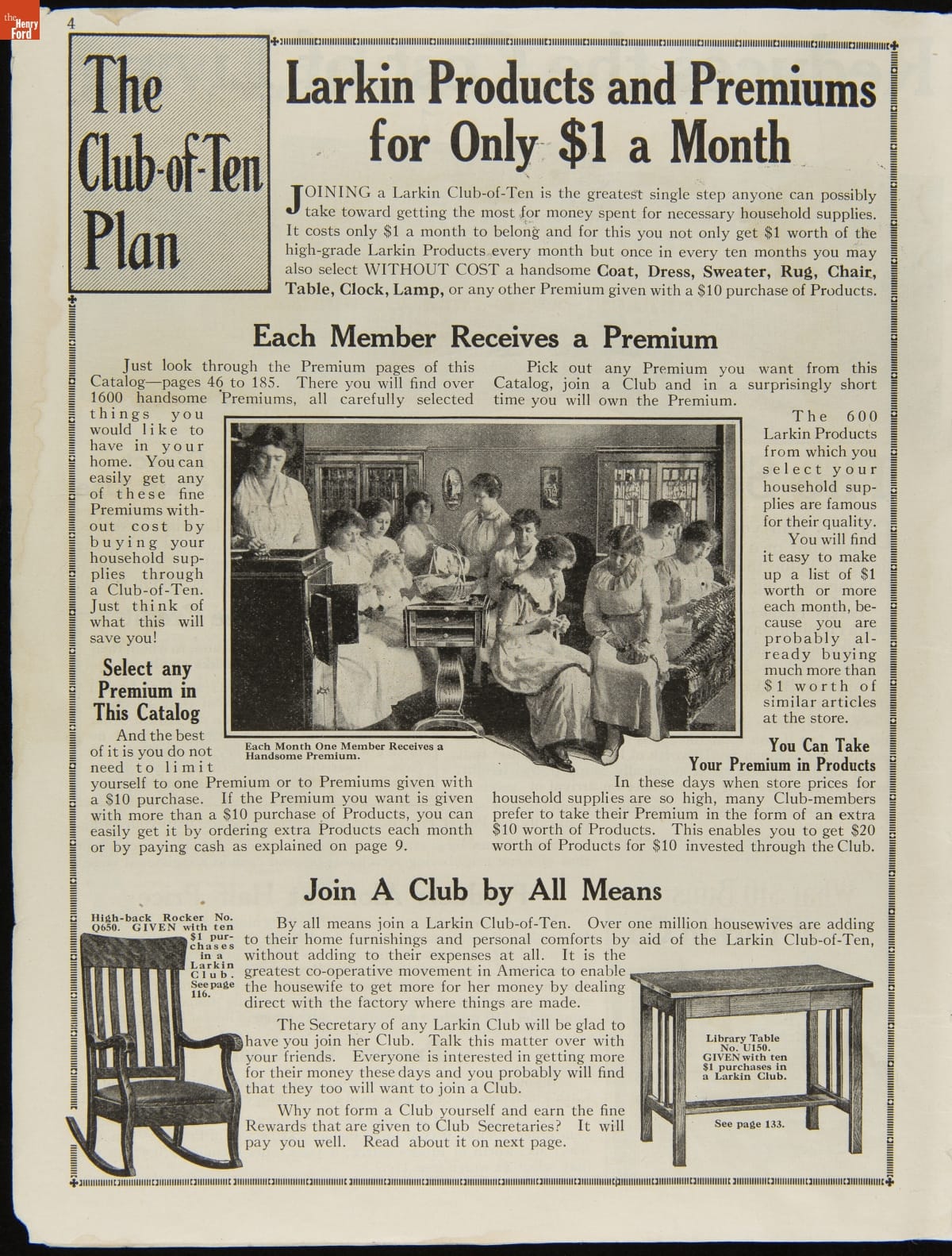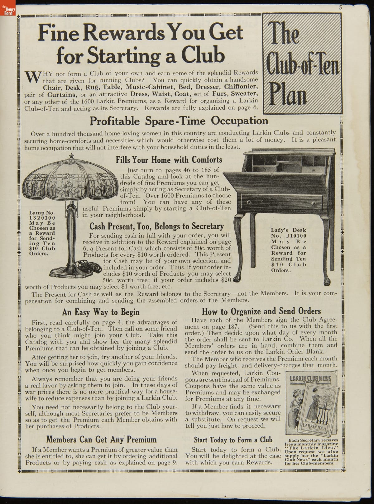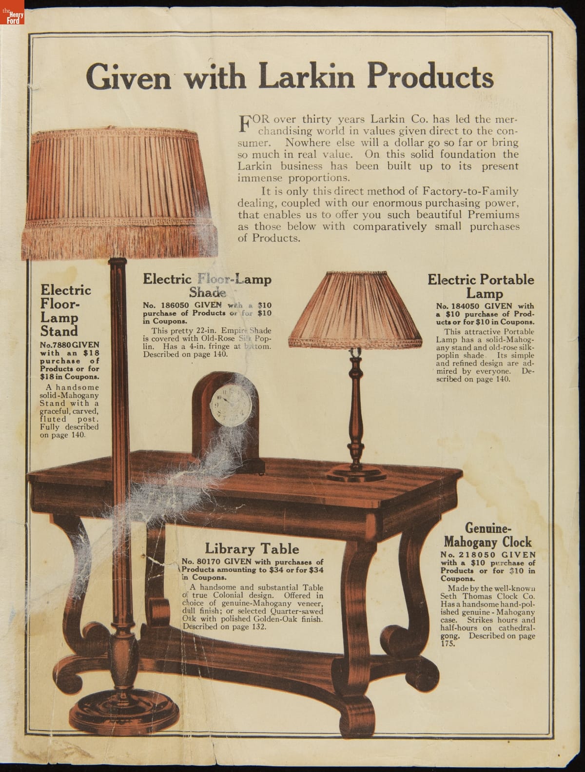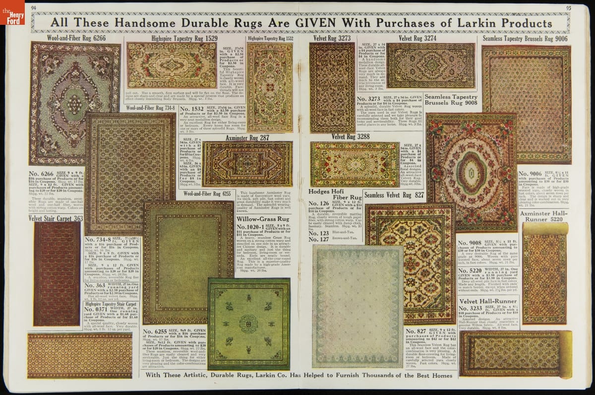 John D. Larkin established a soap manufacturing company in 1875. He hired his brother-in-law, Elbert Hubbard, as a salesman. Hubbard developed "The Larkin Idea," a plan that sold goods directly to consumers through mail-order catalogs and offered incentivizing giveaways. It was a success. By the early 1900s, Larkin's catalogs contained pages of products and even more pages of premiums from which customers could choose.
