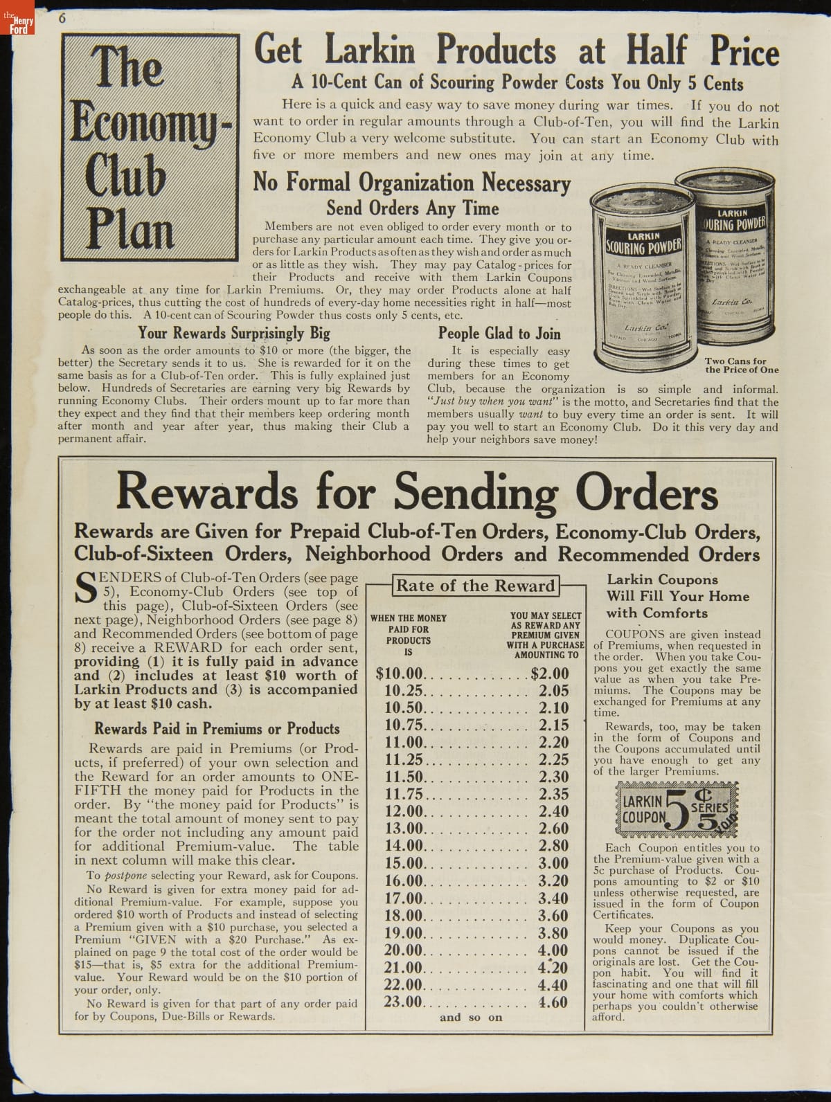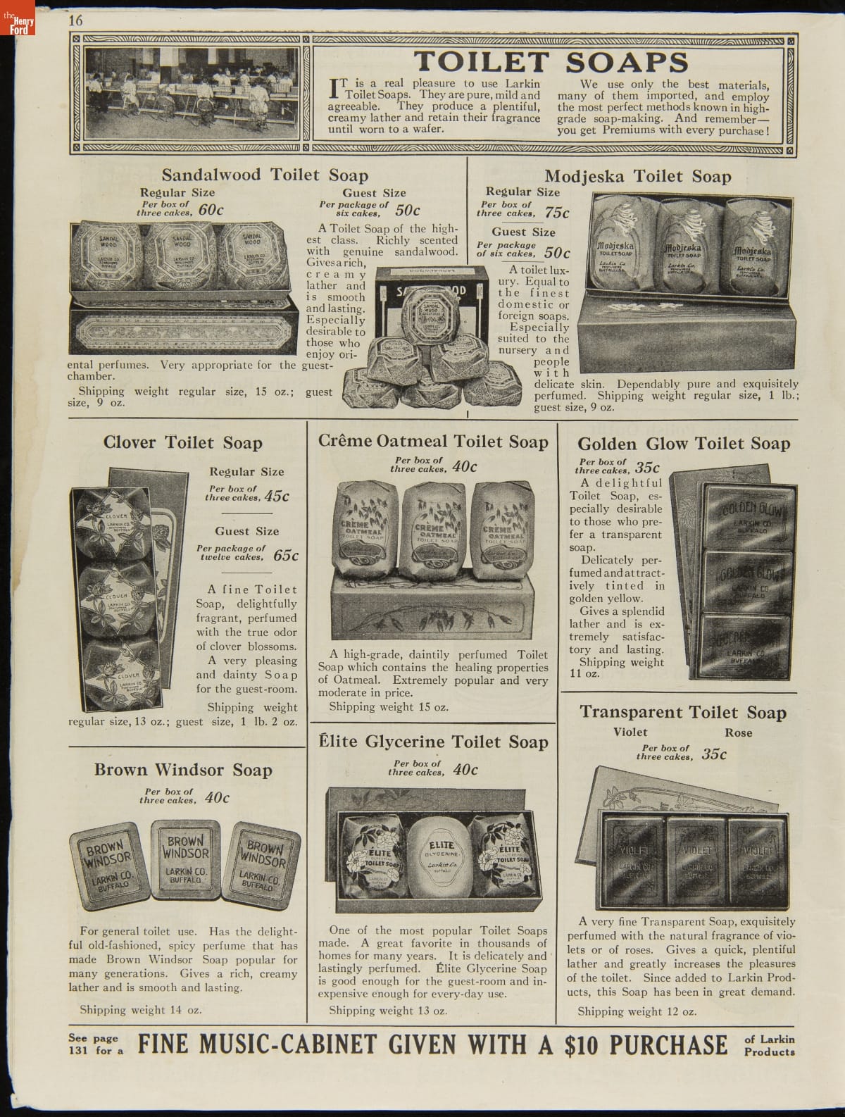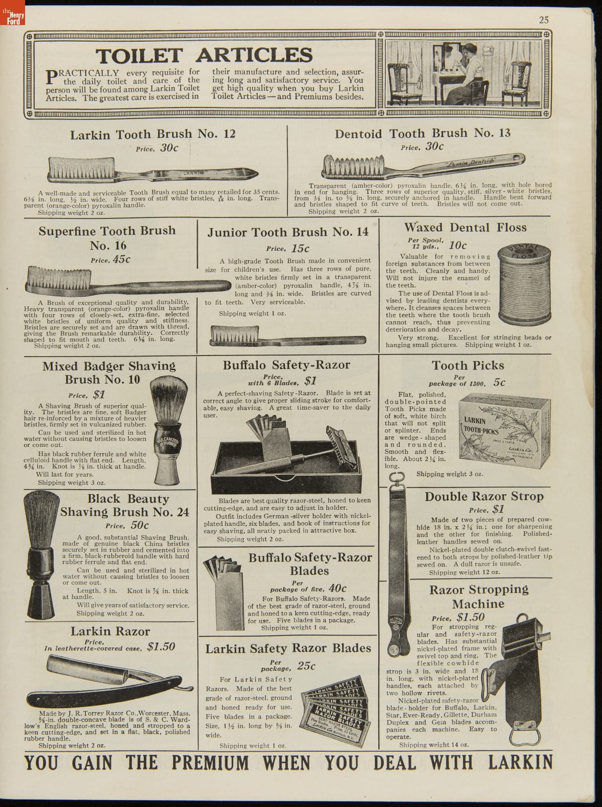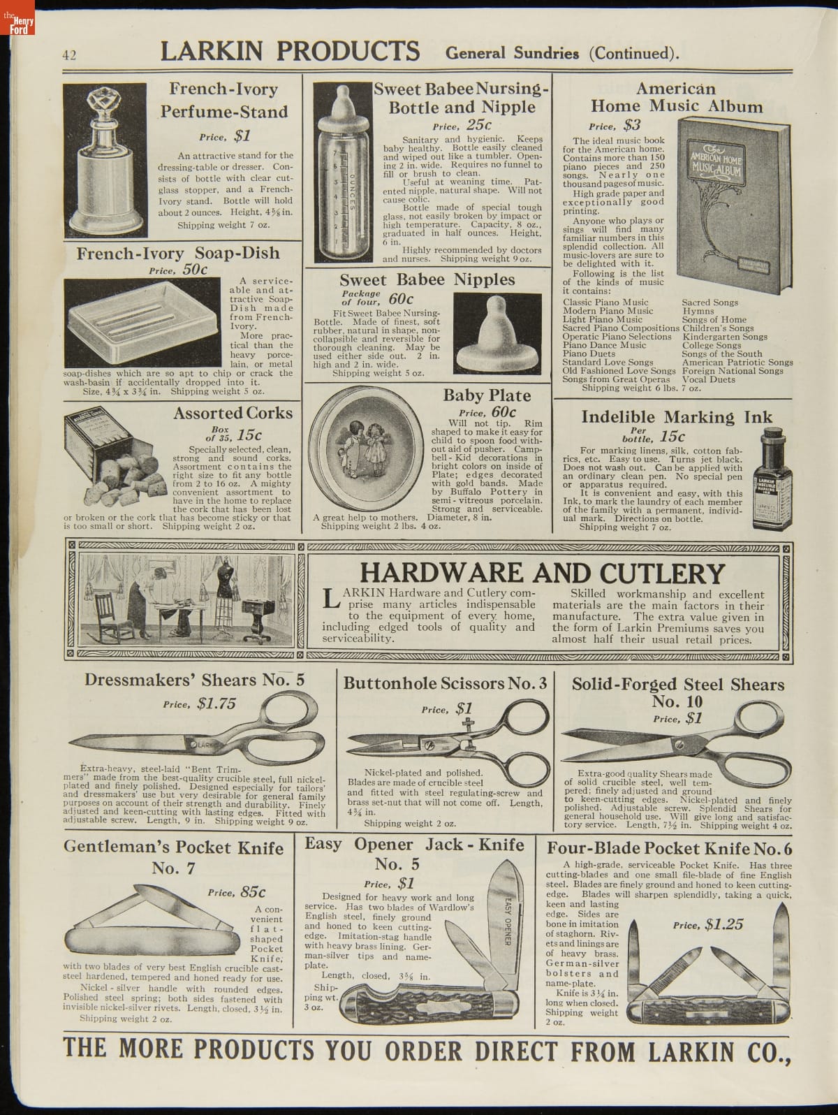 John D. Larkin established a soap manufacturing company in 1875. He hired his brother-in-law, Elbert Hubbard, as a salesman. Hubbard developed "The Larkin Idea," a plan that sold goods directly to consumers through mail-order catalogs and offered incentivizing giveaways. It was a success. By the early 1900s, Larkin's catalogs contained pages of products and even more pages of premiums from which customers could choose.