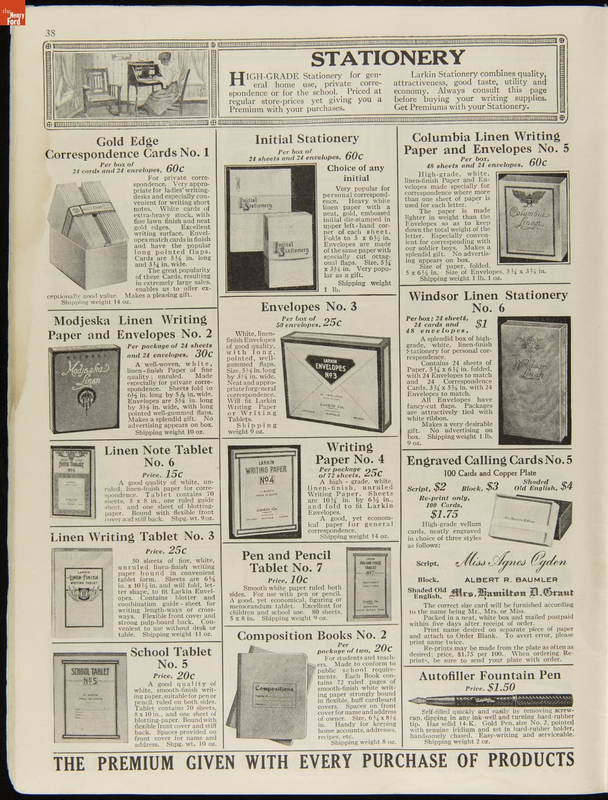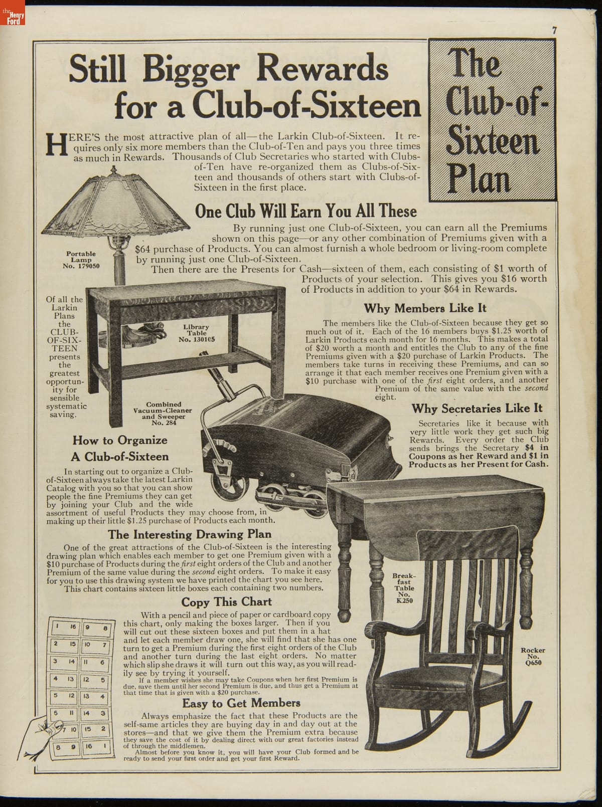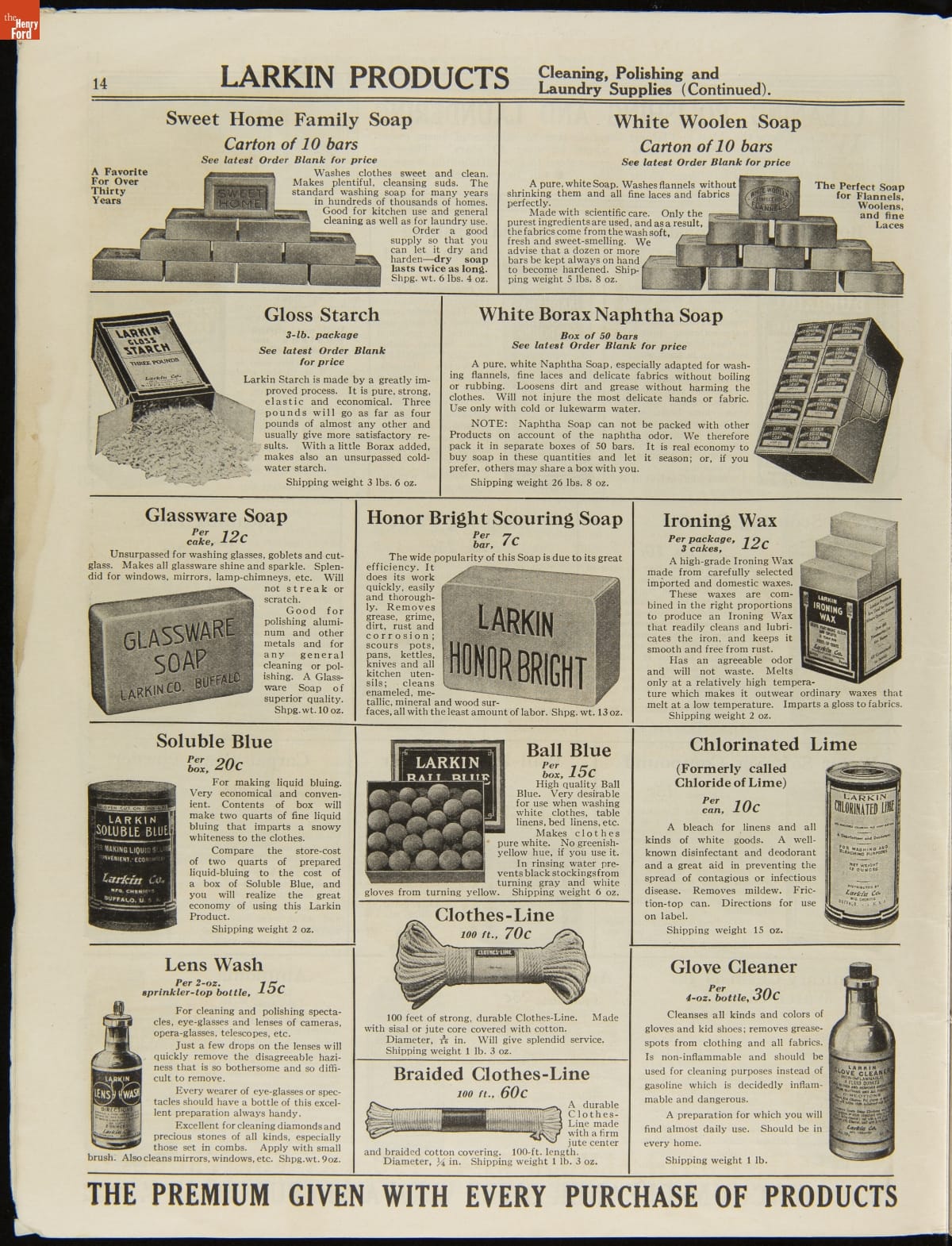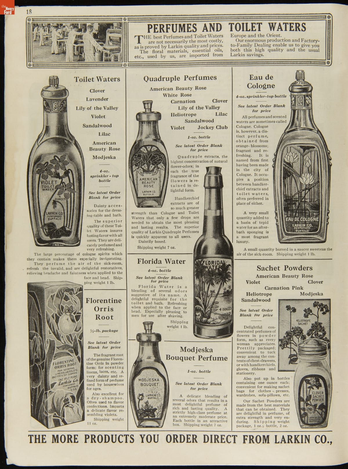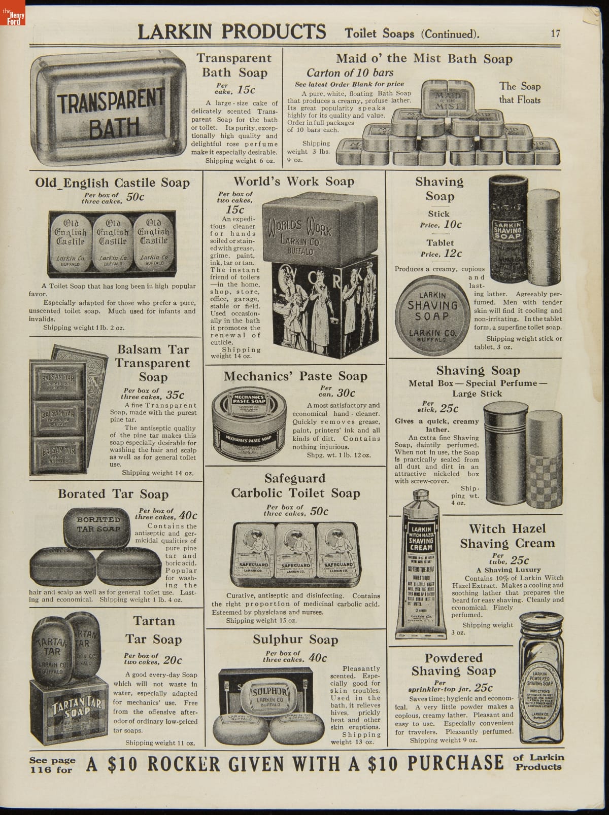 John D. Larkin established a soap manufacturing company in 1875. He hired his brother-in-law, Elbert Hubbard, as a salesman. Hubbard developed "The Larkin Idea," a plan that sold goods directly to consumers through mail-order catalogs and offered incentivizing giveaways. It was a success. By the early 1900s, Larkin's catalogs contained pages of products and even more pages of premiums from which customers could choose.