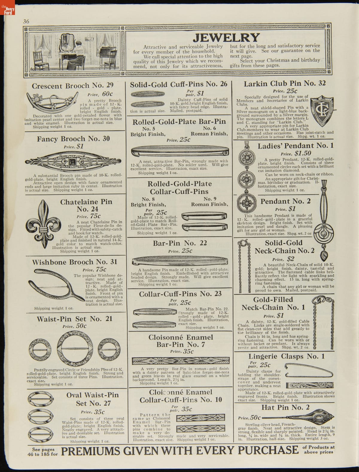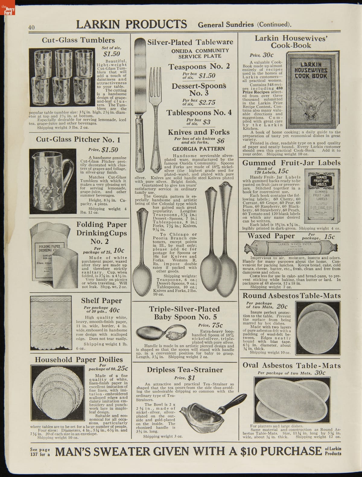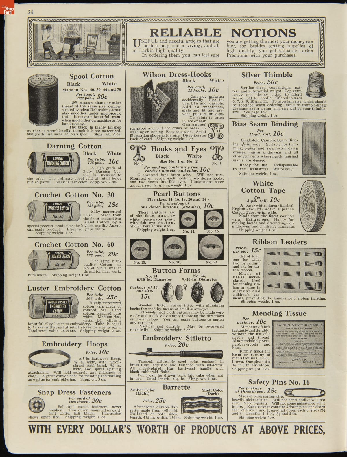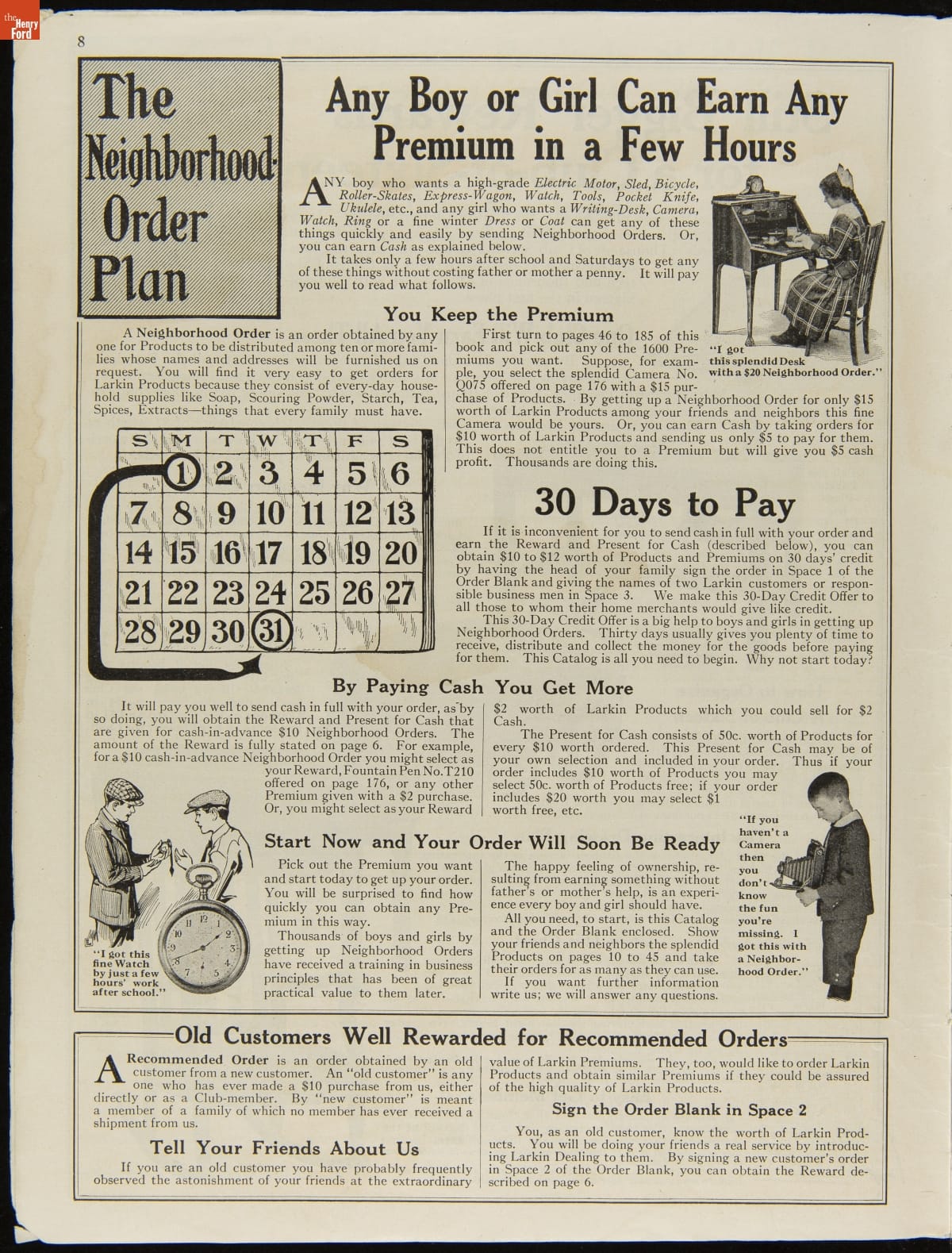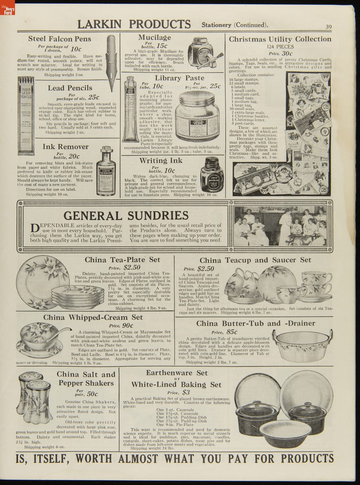 John D. Larkin established a soap manufacturing company in 1875. He hired his brother-in-law, Elbert Hubbard, as a salesman. Hubbard developed "The Larkin Idea," a plan that sold goods directly to consumers through mail-order catalogs and offered incentivizing giveaways. It was a success. By the early 1900s, Larkin's catalogs contained pages of products and even more pages of premiums from which customers could choose.