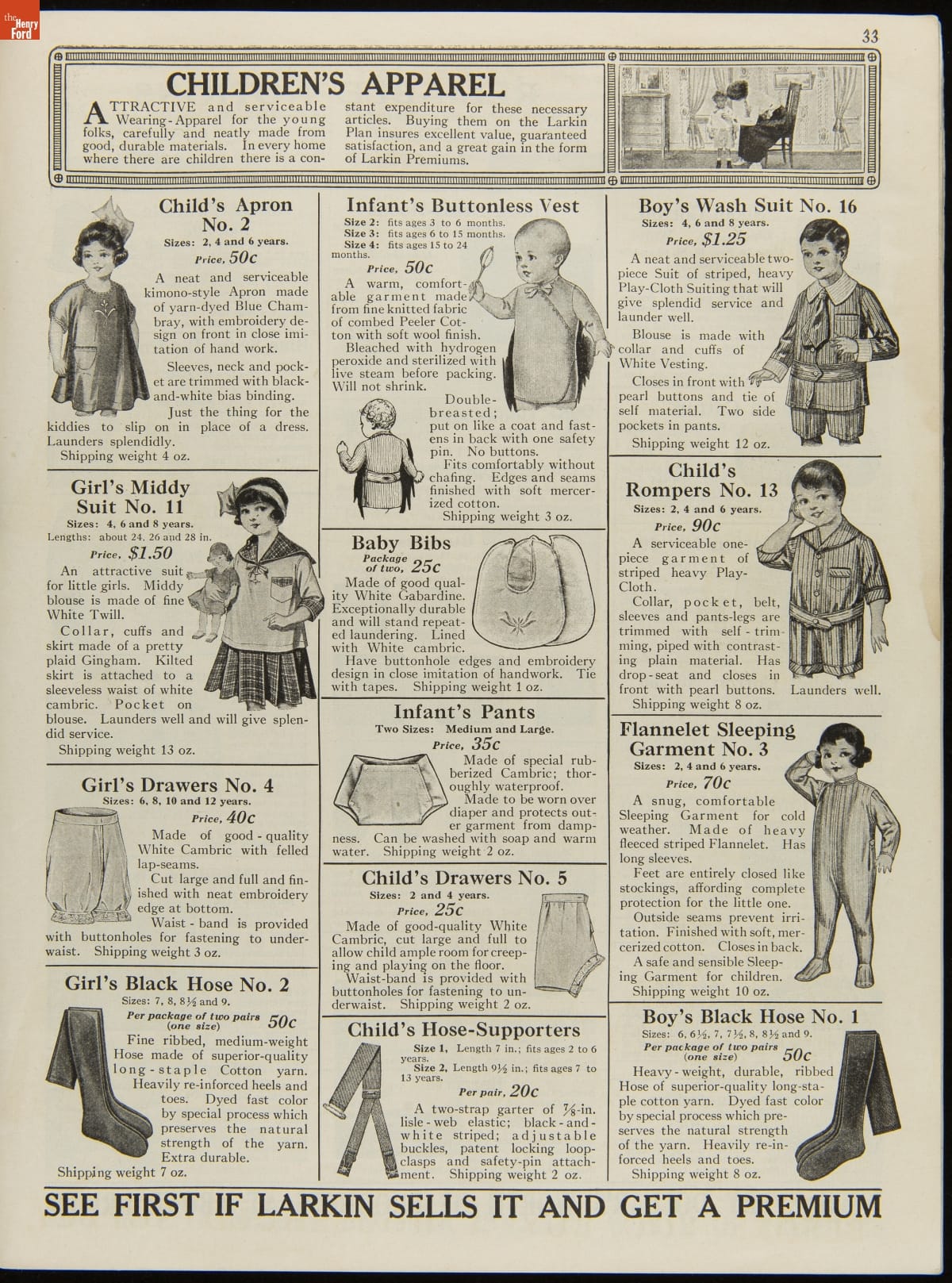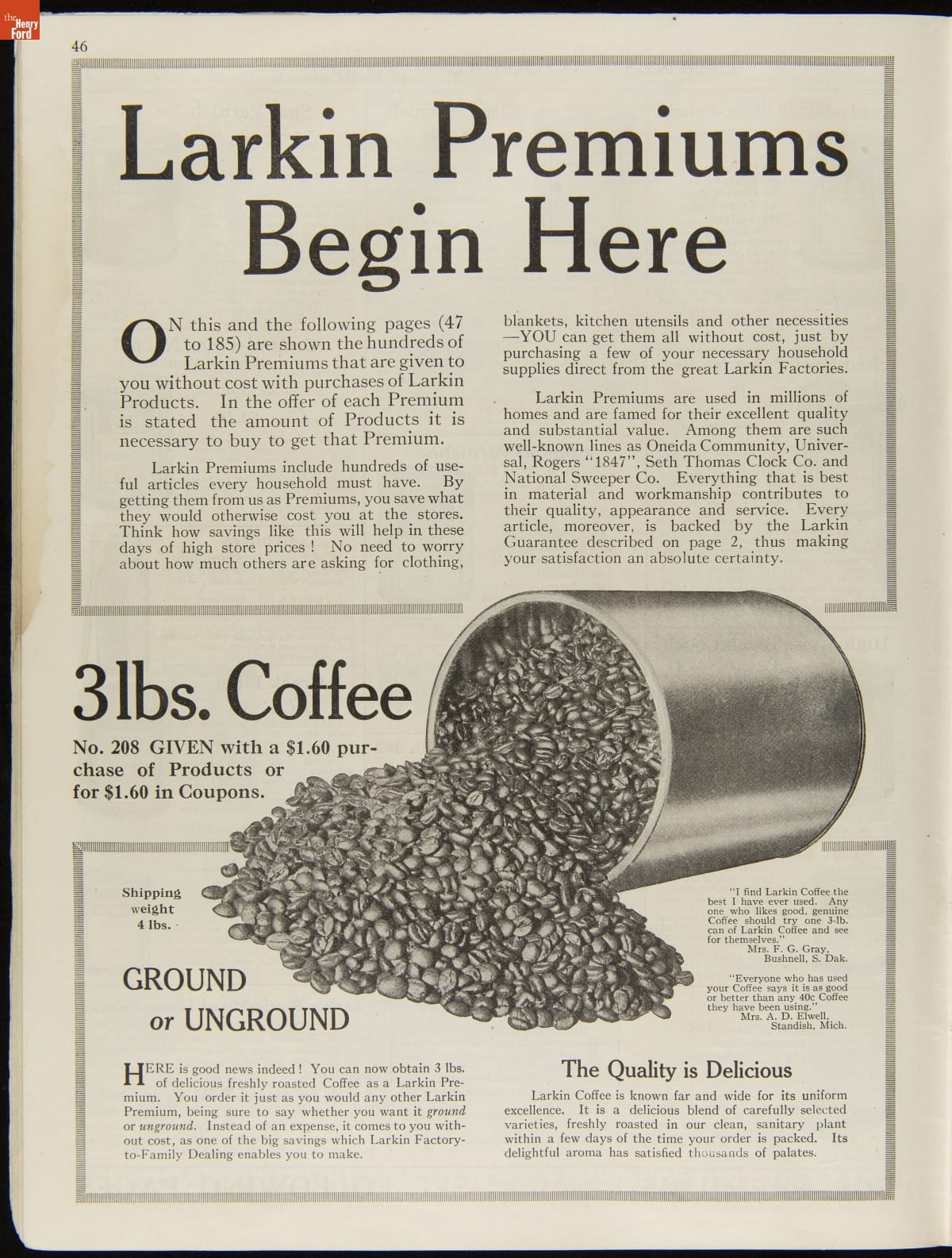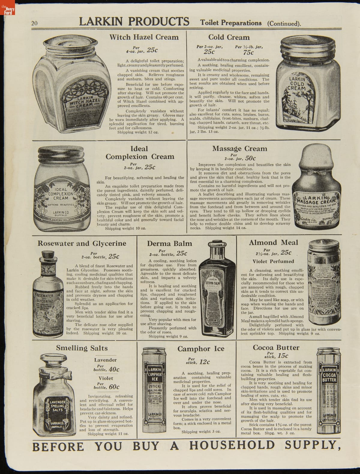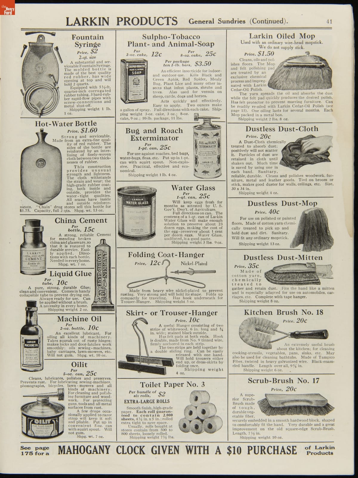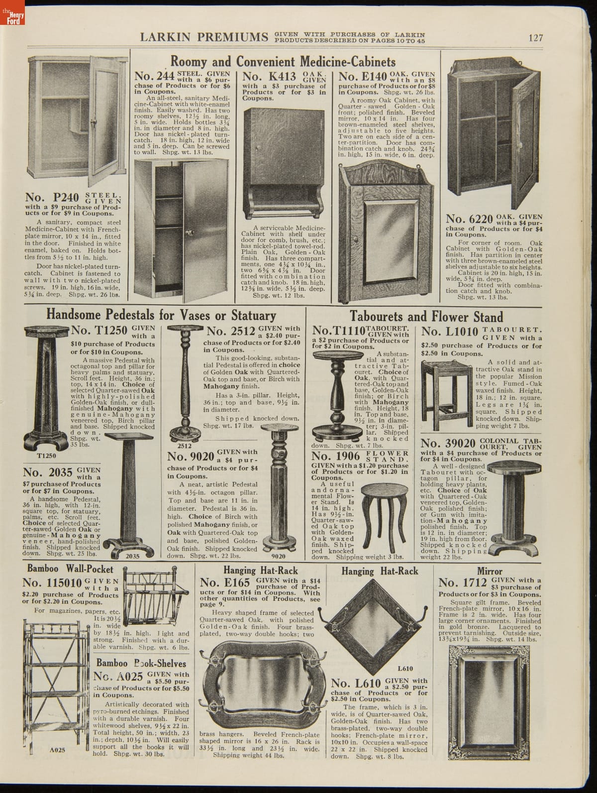 John D. Larkin established a soap manufacturing company in 1875. He hired his brother-in-law, Elbert Hubbard, as a salesman. Hubbard developed "The Larkin Idea," a plan that sold goods directly to consumers through mail-order catalogs and offered incentivizing giveaways. It was a success. By the early 1900s, Larkin's catalogs contained pages of products and even more pages of premiums from which customers could choose.