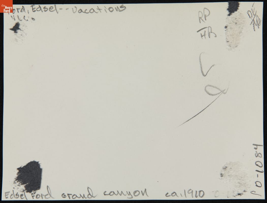 Henry Ford and his family spent the beginning of January 1911 visiting the Grand Canyon. Edsel noted in his diary that on New Year's Day he joined his parents on a hike in the canyon. Other activities included visiting with Clara's sister Eva and her husband, watching Native American dances in the Hopi House, and photographing the canyon.